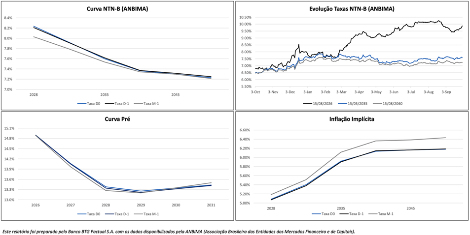 Fiscal e curva: o debate fiscal continua sendo o limitador para duration muito longa; por isso, esperamos que o movimento de fechamento siga concentrado nos vértices intermediários.
