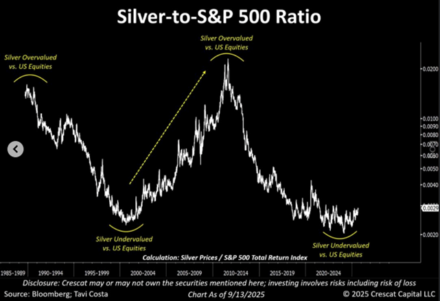 Prata muito desvalorizada em relação ao S&P 500, ainda no início do ciclo
